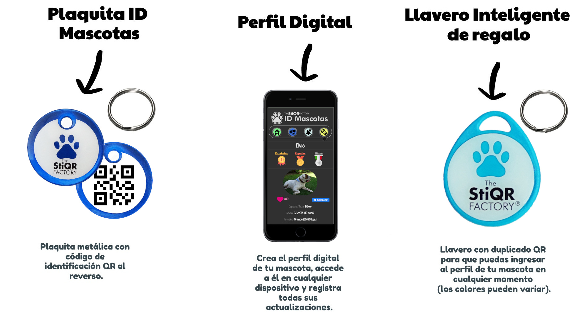 El precio que pagas incluye tu plaquita de identificación personalizada, con un código QR al reverso, un juego de argollas y la suscripción permanente al servicio digital.