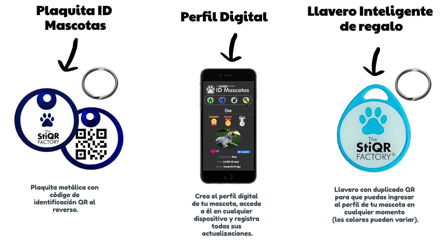 El precio que pagas incluye tu plaquita de identificación personalizada, con un código QR al reverso, un juego de argollas y la suscripción permanente al servicio digital.