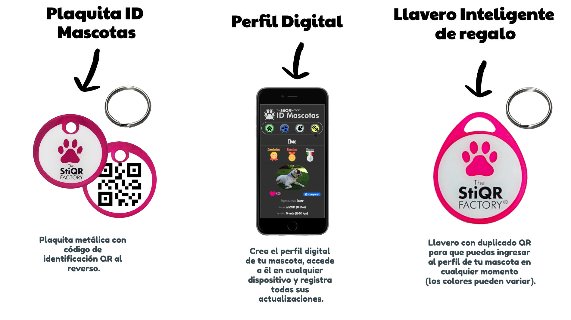 El precio que pagas incluye tu plaquita de identificación personalizada, con un código QR al reverso, un juego de argollas y la suscripción permanente al servicio digital.