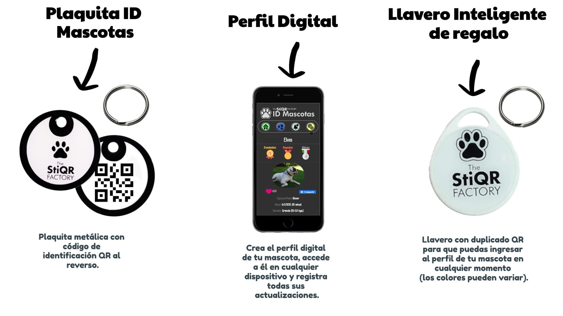 El precio que pagas incluye tu plaquita de identificación personalizada, con un código QR al reverso, un juego de argollas y la suscripción permanente al servicio digital.