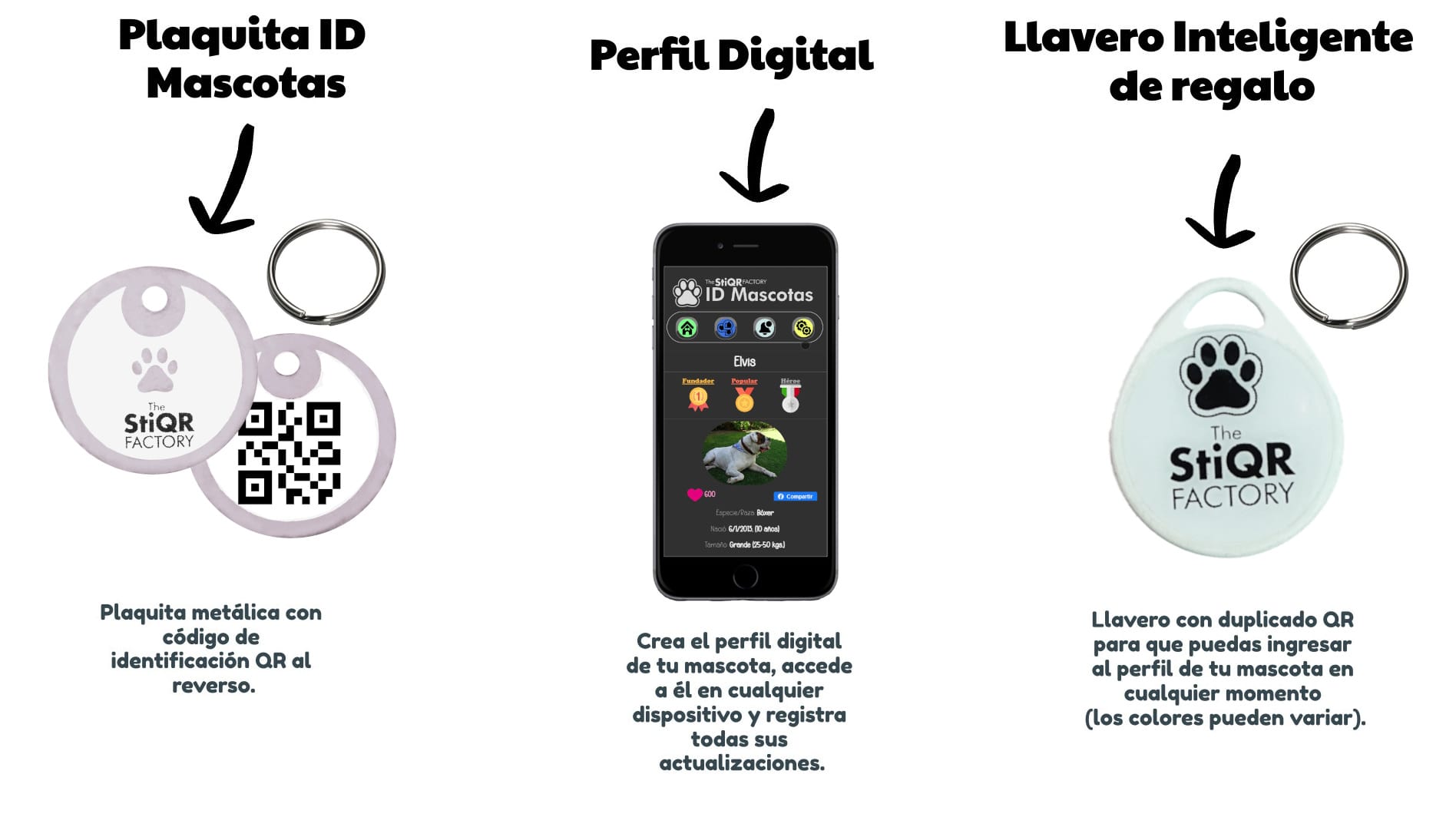 El precio que pagas incluye tu plaquita de identificación personalizada, con un código QR al reverso, un juego de argollas y la suscripción permanente al servicio digital.