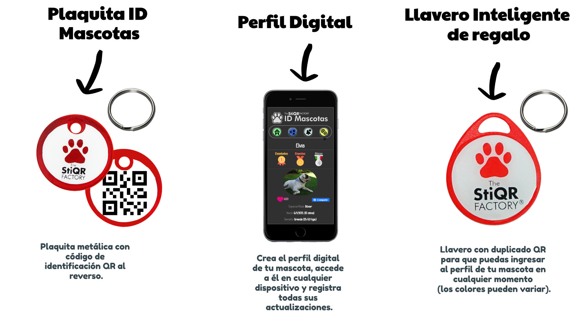 El precio que pagas incluye tu plaquita de identificación personalizada, con un código QR al reverso, un juego de argollas y la suscripción permanente al servicio digital.