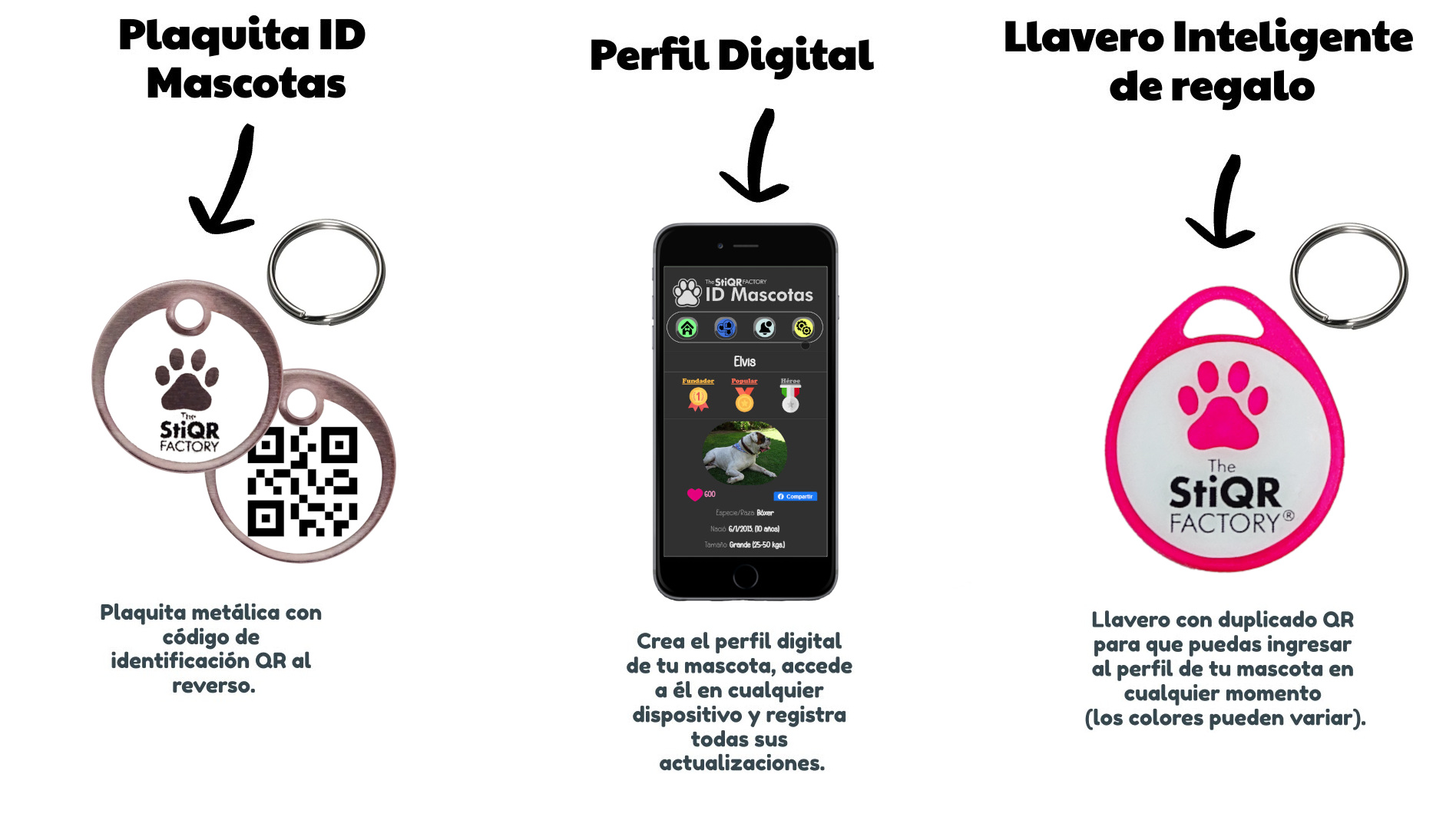 El precio que pagas incluye tu plaquita de identificación personalizada, con un código QR al reverso, un juego de argollas y la suscripción permanente al servicio digital.
